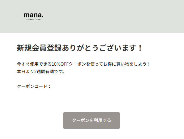4.初回登録完了後には、「【mana.】10%OFFクーポンを獲得しました!」という件名のメールが届きます。